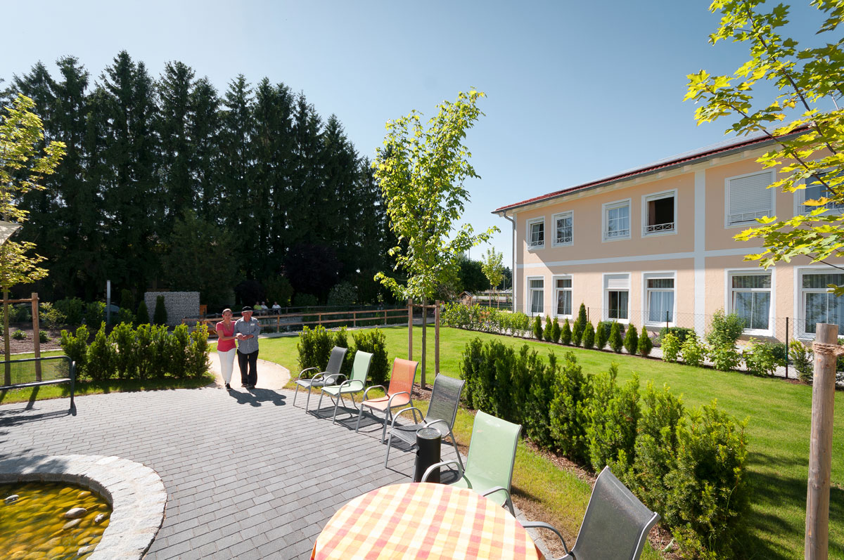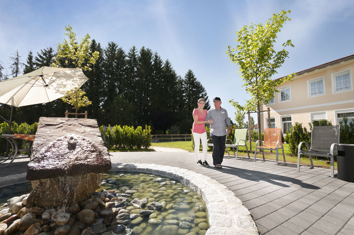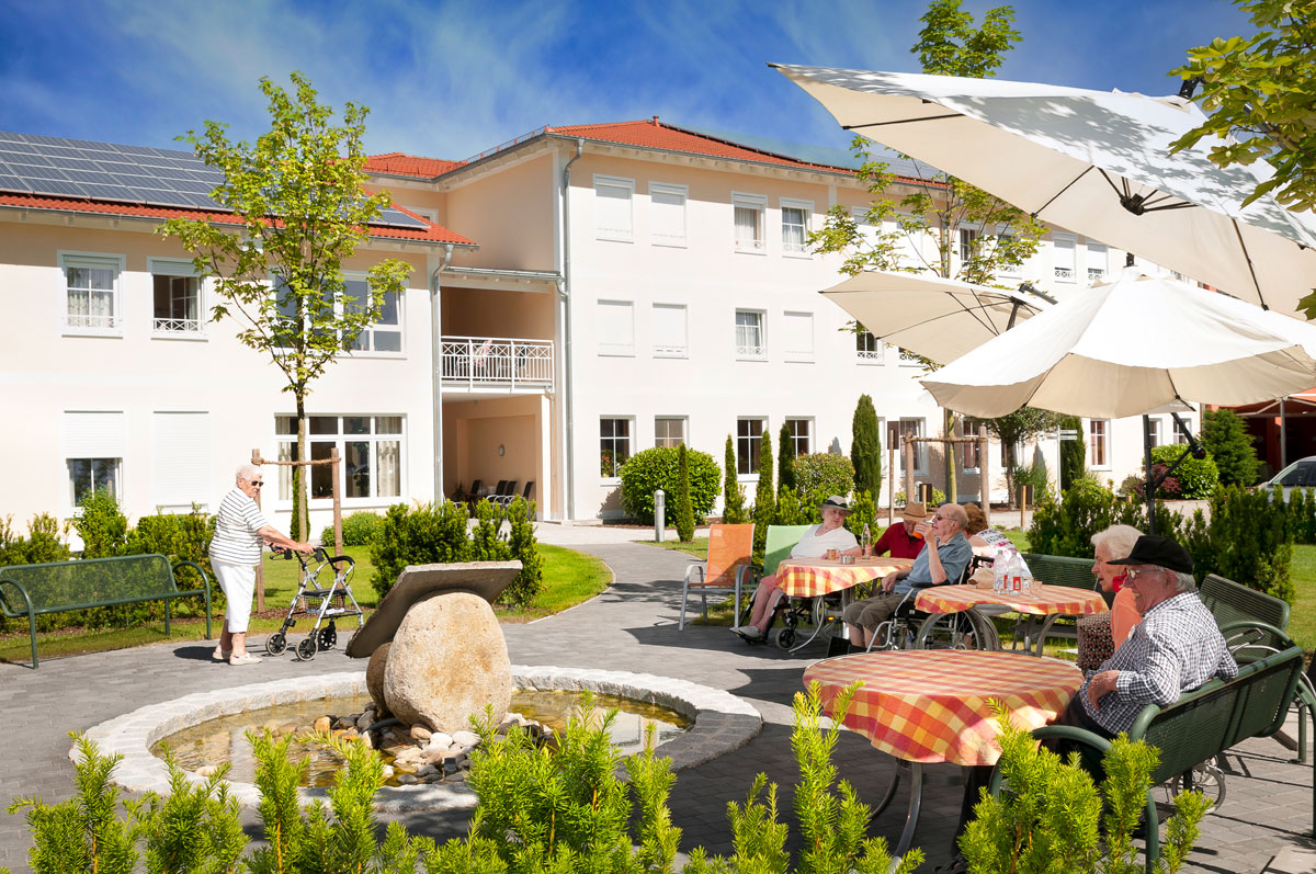 Das Gebäude ist sehr wohnlich, gemütlich und bietet ein schönes, neues Zuhause. Die zahlreichen Sonnenterrassen mit schönen schattigen Plätzen, sowie offene Aufenthaltsbereiche auf allen Etagen bieten viel Raum für Begegnungen unter den Bewohnern, oder mit Angehörigen und Freunden. Zudem ist unser plätschernder Springbrunnen in der Mitte unseres Gartens ein gerne besuchter Treffpunkt.